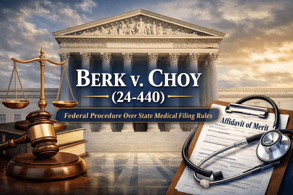 On January 20, 2026, the U.S. Supreme Court issued a unanimous decision in Berk v. Choy, No. 24-440, resolving a contentious procedural issue at the intersection of state tort reform and federal civil procedure: whether a Delaware statute that bars medical malpractice suits unless accompanied by an expert “affidavit of merit” can be enforced in federal court. The Court, in an opinion delivered by Justice Barrett, held that Delaware’s affidavit requirement does not apply in federal court because it is displaced by the Federal Rules of Civil Procedure. The decision reverses the Third Circuit and underscores the primacy of uniform federal procedural rules in federal diversity cases.